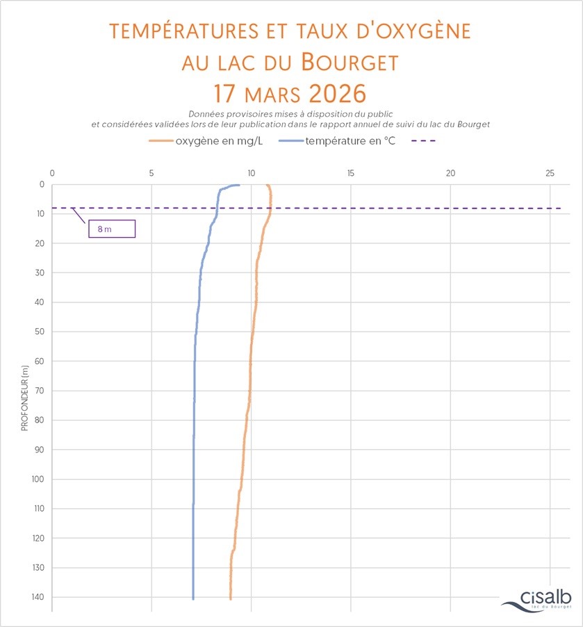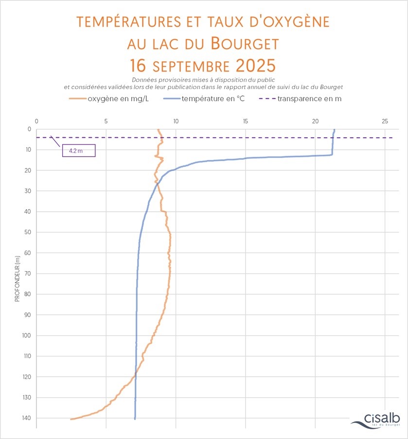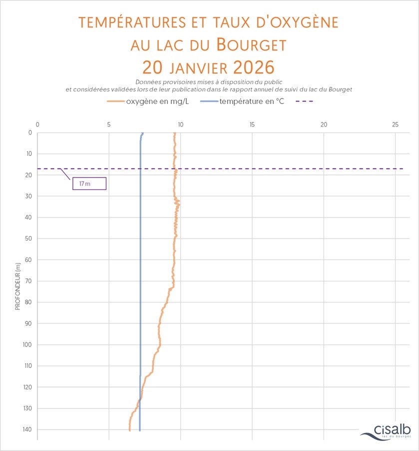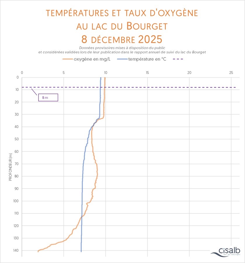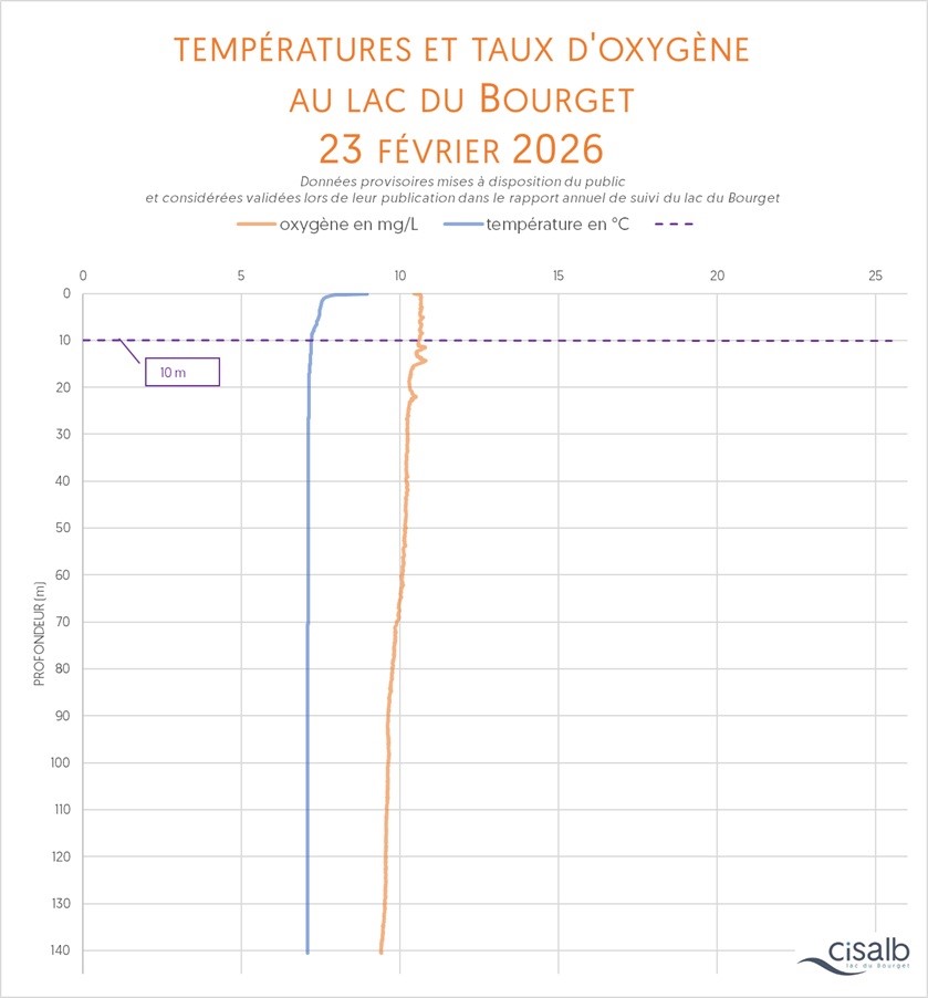 La température (en °C) de la colonne d'eau du lac dévoile plusieurs informations : sa situation par rapport au brassage de l'eau entre la surface et la profondeur (attendu chaque année), la mise en place de la thermocline et son évolution au fil du temps (véritable barrière invisible dans la colonne d'eau), les conditions de survie de la fune et de la flore, bref, c'est un paramètre essentiel pour témoigner de la vie biologique du plan d'eau.